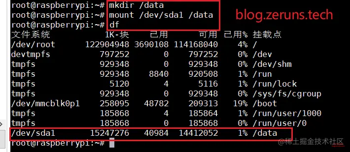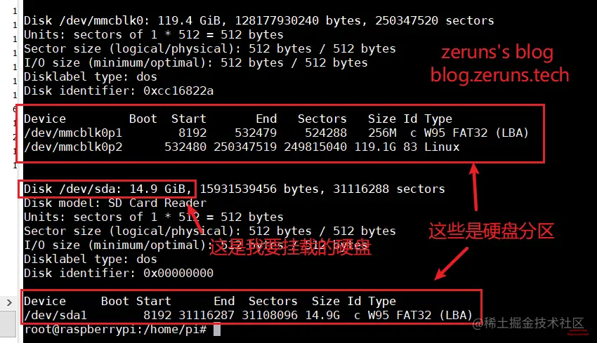 从上图可以看出,树莓派的 /dev/sda 硬盘的大小是 14.9G,而我插进去的SD卡是16G的(进制的问题,实际空间是15G),也就是我要挂载的硬盘。
