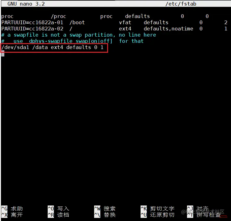/dev/sda1 /data ext4 defaults 0 1 #如果上面用的是ext3,这里也要用ext3;