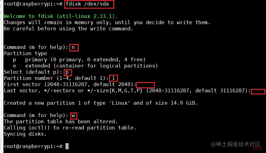因为这SD卡空间不大,所以我就全部用来做主分区了,如果你想把一个磁盘分成好几块,可以继续按此命令分区即可;你可以继续创建扩展分区......;