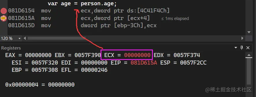 这三句汇编还是很好理解的,4C41F4Ch 存放的是 person 对象, ecx+4 是取 person.age,最后一句就是将 age 放在 ebp-3Ch 栈位置上,接下来我们来看下 null 时的 ecx 到底是多少,截图如下: