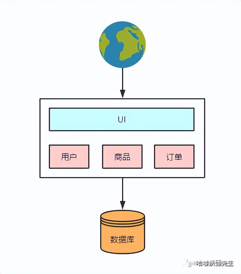 通俗地讲,“单体应用(monolith application)”就是将应用程序的所有功能都打包成一个独立的单元。当网站流量很小时,只需一个应用,将所有功能都部署在一起,以减少部署节点和成本。