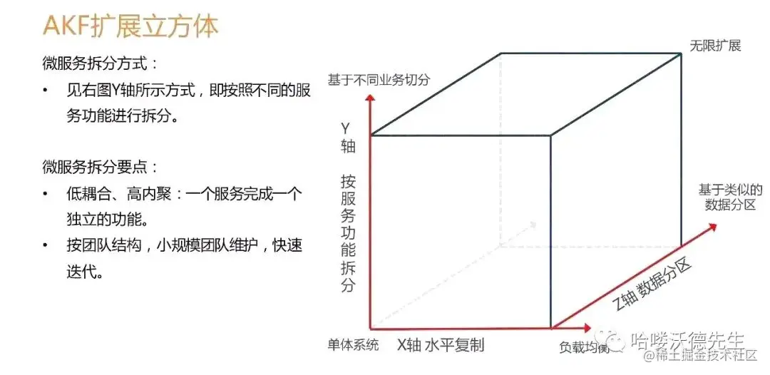 一个叫 AKF 的公司的技术专家抽象总结的应用扩展的三个维度。理论上按照这三个扩展模式,可以将一个单体系统,进行无限扩展。