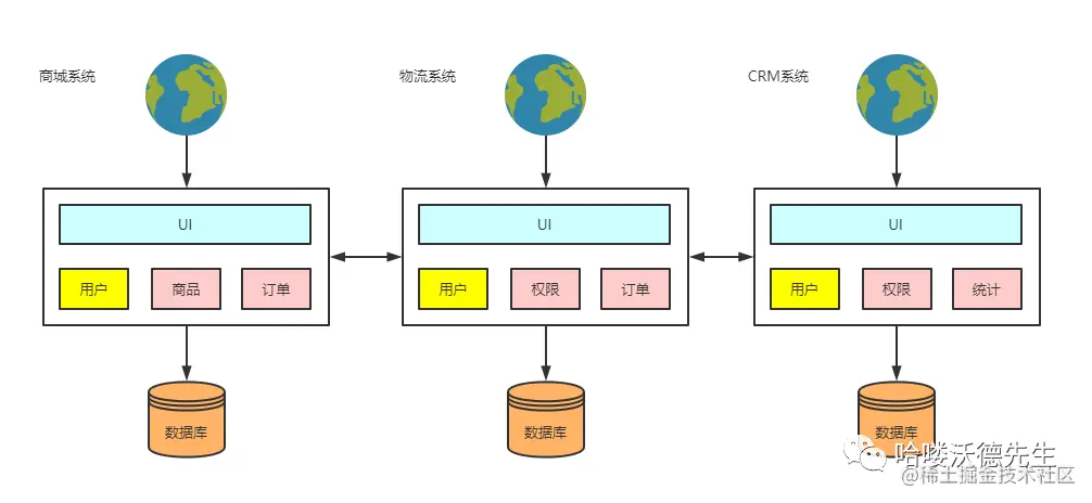 - 项目与项目之间存在数据冗余,耦合性较大,比如上图中三个项目都存在用户信息。