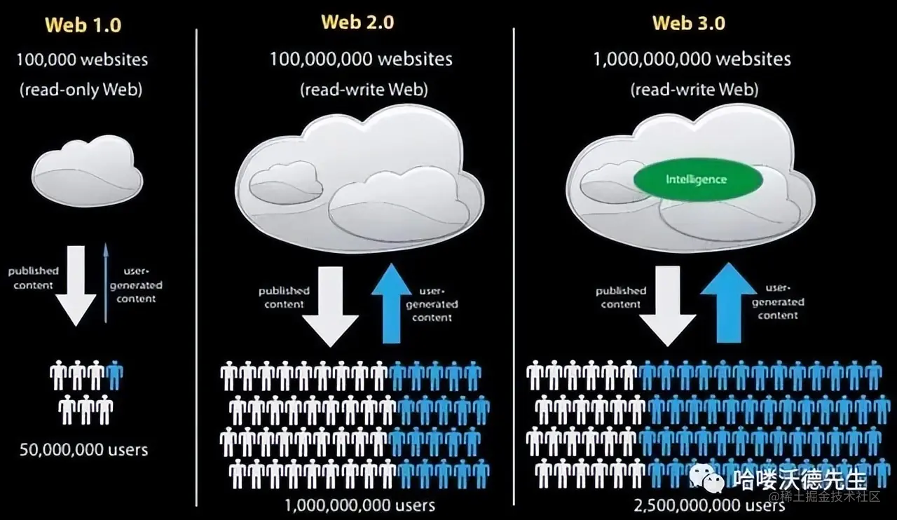 - WEB3.0时代:你晚上一进餐馆,一进门老板就说:客官,来碗面条吧!你问为啥,老板说,你连续吃一礼拜面条了。(主动分析)WEB 3.0 是微服务、大数据、云计算、人工智能的时代。