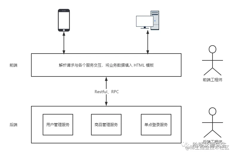 这种应用模式比较适合纯网页应用,但是当后端对接 App 时,App 可能并不需要后端返回一个 HTML 网页,而仅仅是数据本身,所以后端原本返回网页的接口不再适用于前端 App 应用,为了对接 App 后端还需再开发一套接口。
