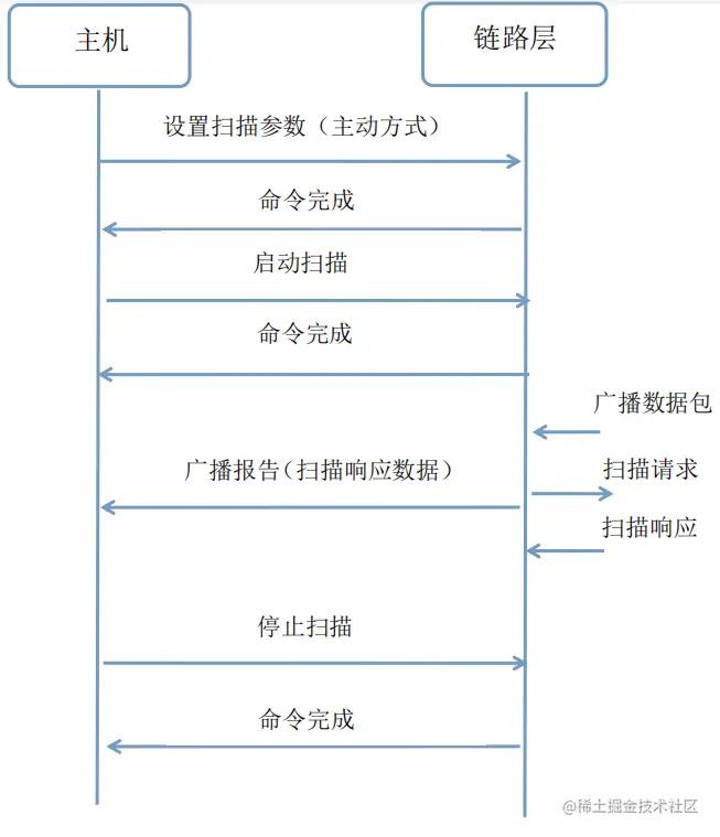 控制器收到扫描数据后将向主机发送一个广播报告事件(adv_report),该事件包括了链路层数据包的广播类型。因此,主机能够判断从端设备是否可以连接或扫描,并且区分出广播数据包和扫描响应包。