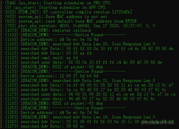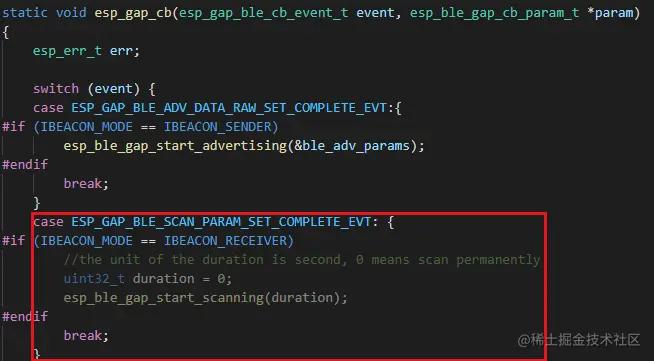 一旦设置了扫描参数,就会触发 ESP_GAP_BLE_SCAN_PARAM_SET_COMPLETE_EVT 事件,该事件由GAP事件处理程序 esp_gap_cb() 处理。这个事件是用来开始扫描附近的GATT服务器