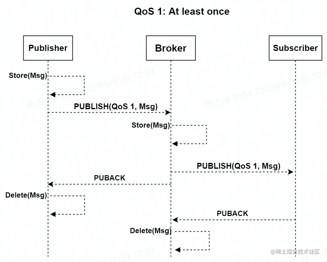 当 QoS 为 1 时,可以保证消息至少送达一次。MQTT 通过简单的 ACK 机制来保证 QoS 1。发布者会发布消息,并等待接收者的 PUBACK 报文的应答,如果在规定的时间内没有收到 PUBACK 的应答,发布者会将消息的 DUP 置为 1 并重发消息。接收者接收到 QoS 为 1 的消息时应该回应 PUBACK 报文,接收者可能会多次接受同一个消息,无论 DUP 标志如何,接收者都会将收到的消息当作一个新的消息并发送 PUBACK 报文应答