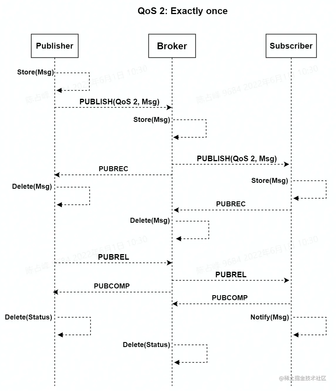 QoS 2 设计了重发和重复消息发现机制,保证消息到达对方并且严格只到达一次。