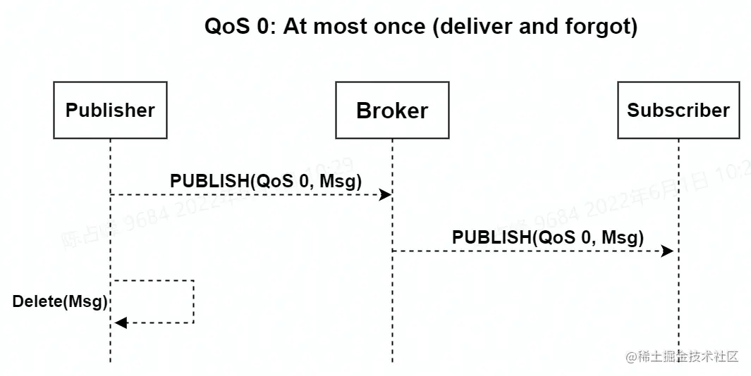 QoS 0 是一种 "fire and forget" 的消息发送模式:Sender (可能是 Publisher 或者 Broker) 发送一条消息之后,就不再关心它有没有发送到对方,也不设置任何重发机制。