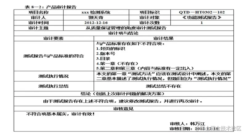 这个例子也是针对产品审计,审计的对象是功能测试报告,根据审计要素进行审计,给出审计结论,其中某些项是不合格的。