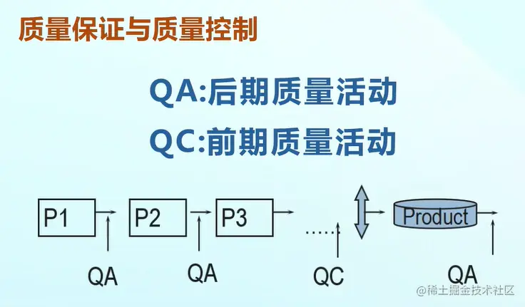 这个图示说明了他们之间的关系,QA是过程执行之后或者产品提交之后的质量活动,属于后期的质量活动。