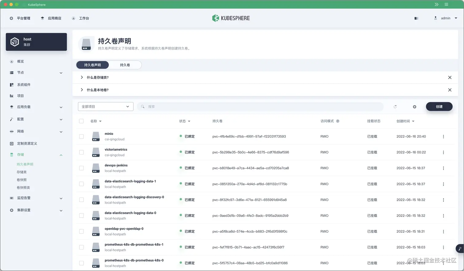 失误失误,我本来是想用分布式存储作为默认存储的,但是我忘记将 csi-qingcloud 设置为默认的 StorageClass 了,反正不管怎样,就这么稀里糊涂地搞错了。虽然重装可以解决 99% 的问题,但作为一名成熟的 YAML 工程师,重装是不可能的,必须在不重装的情况下解决这个问题,才能体现出我的气质!