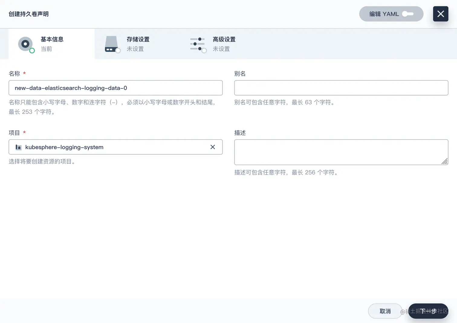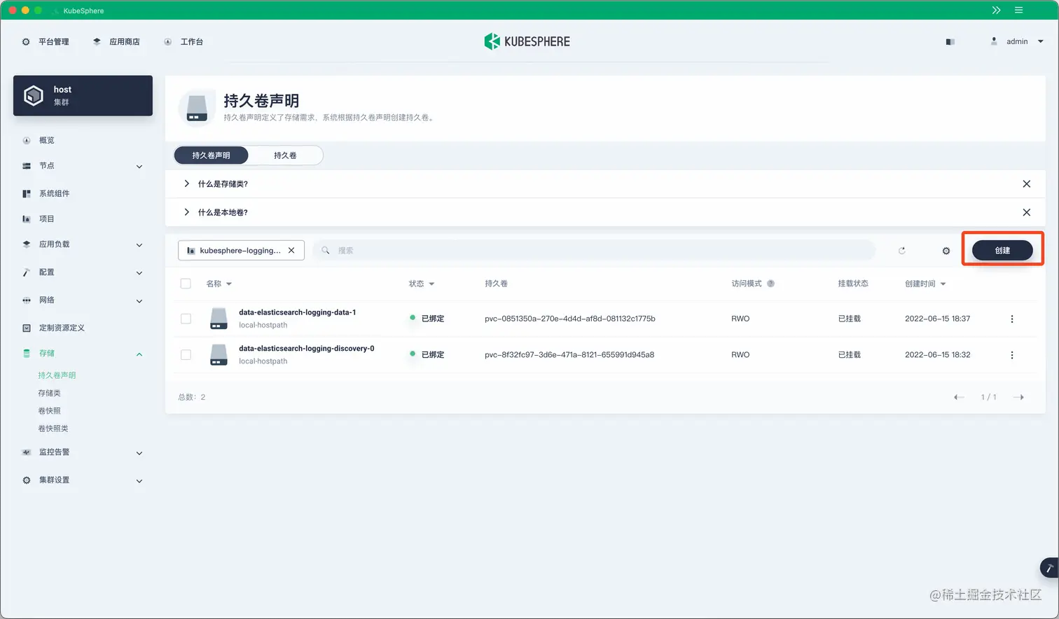 在『存储卷声明』页面点击『创建』: