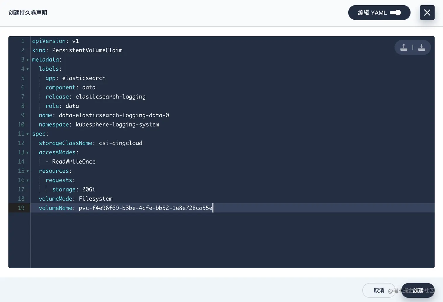 选择『编辑 YAML』,将上面的 YAML 内容复制粘贴进去,然后点击『创建』: