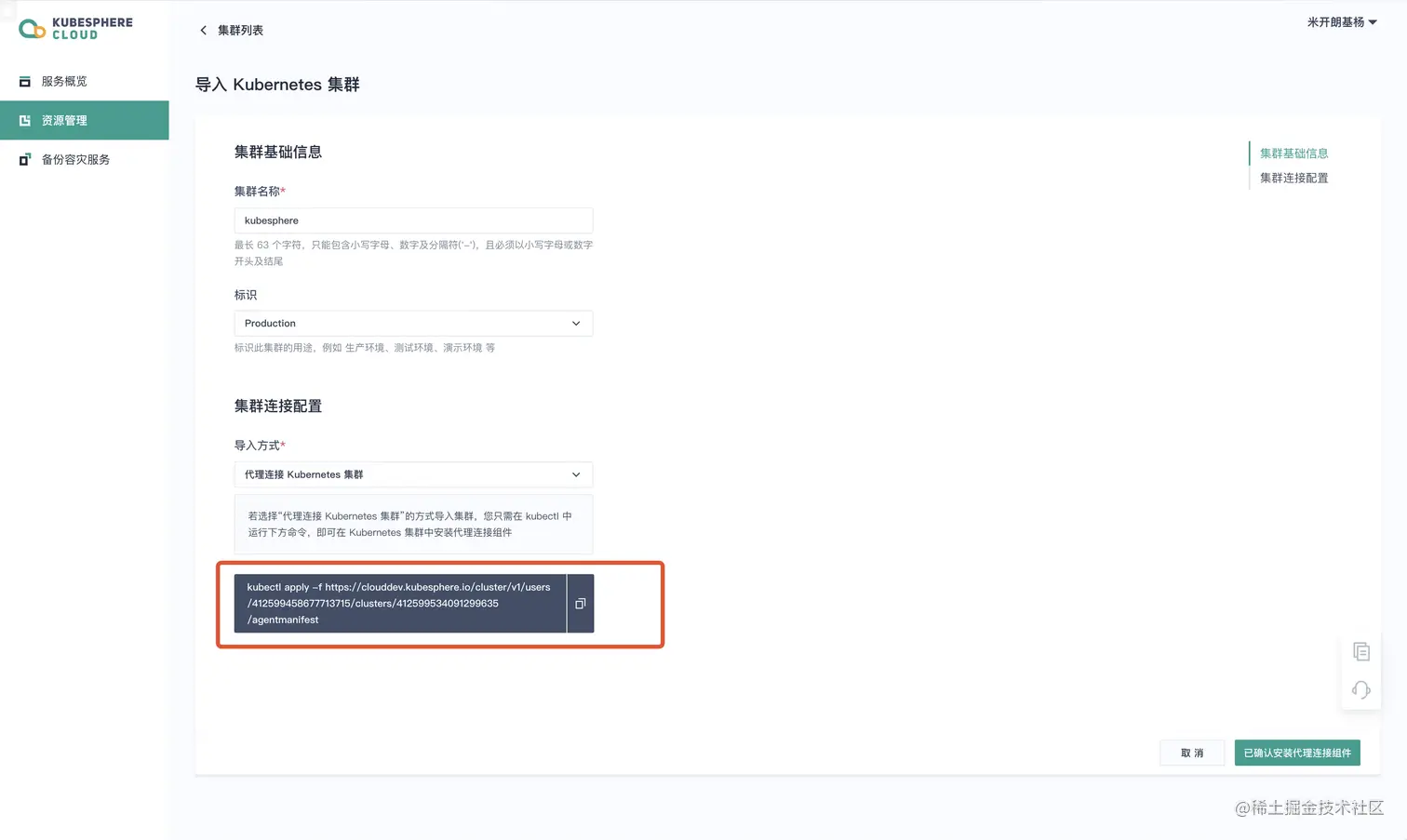 使用起来非常简单,先注册账户,然后导入 Kubernetes 集群。如果选择通过代理连接 Kubernetes 集群,需要执行红色方框内命令在 Kubernetes 集群中安装代理。