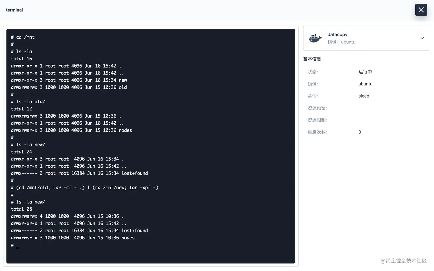 在容器中先验证旧 PV 的挂载点是否包含应用数据,新 PV 的挂载点是否是空的,之后再执行命令 (cd /mnt/old; tar -cf - .) | (cd /mnt/new; tar -xpf -),以确保所有数据的所有权和权限被继承。