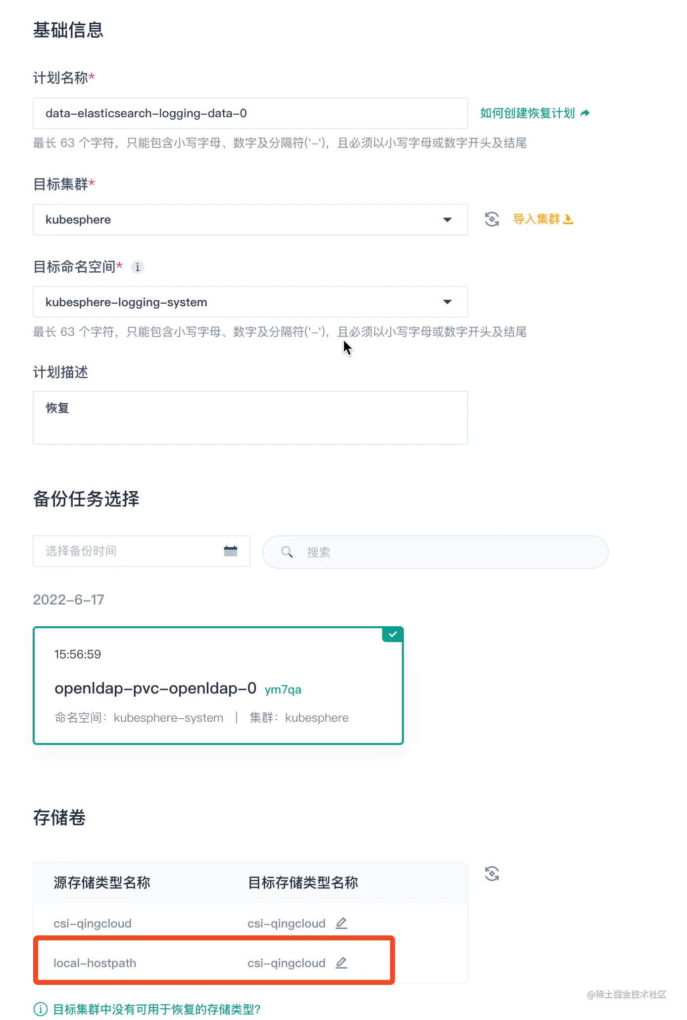 备份成功之后,将集群中的 PVC 和 PV 删除,并将工作负载的副本数缩减为 0。最后创建恢复计划,注意将源存储类型名称为 local-hostpath 的目标存储类型名称设置为你想迁移的存储,这样恢复后的 PV 使用的就是新的 StorageClass。