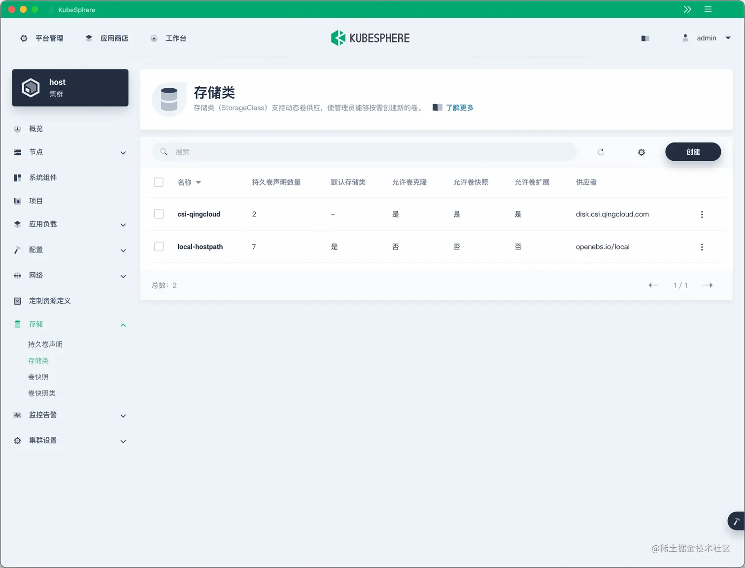 我的 K8s 集群中有两个存储类(StorageClass),一个是 OpenEBS 提供的本地存储,另一个是 QingCloud CSI 提供的分布式存储,而且默认的 StorageClass 是 OpenEBS 提供的 local-hostpath,所以 KubeSphere 的有状态组件默认便使用本地存储来保存数据。