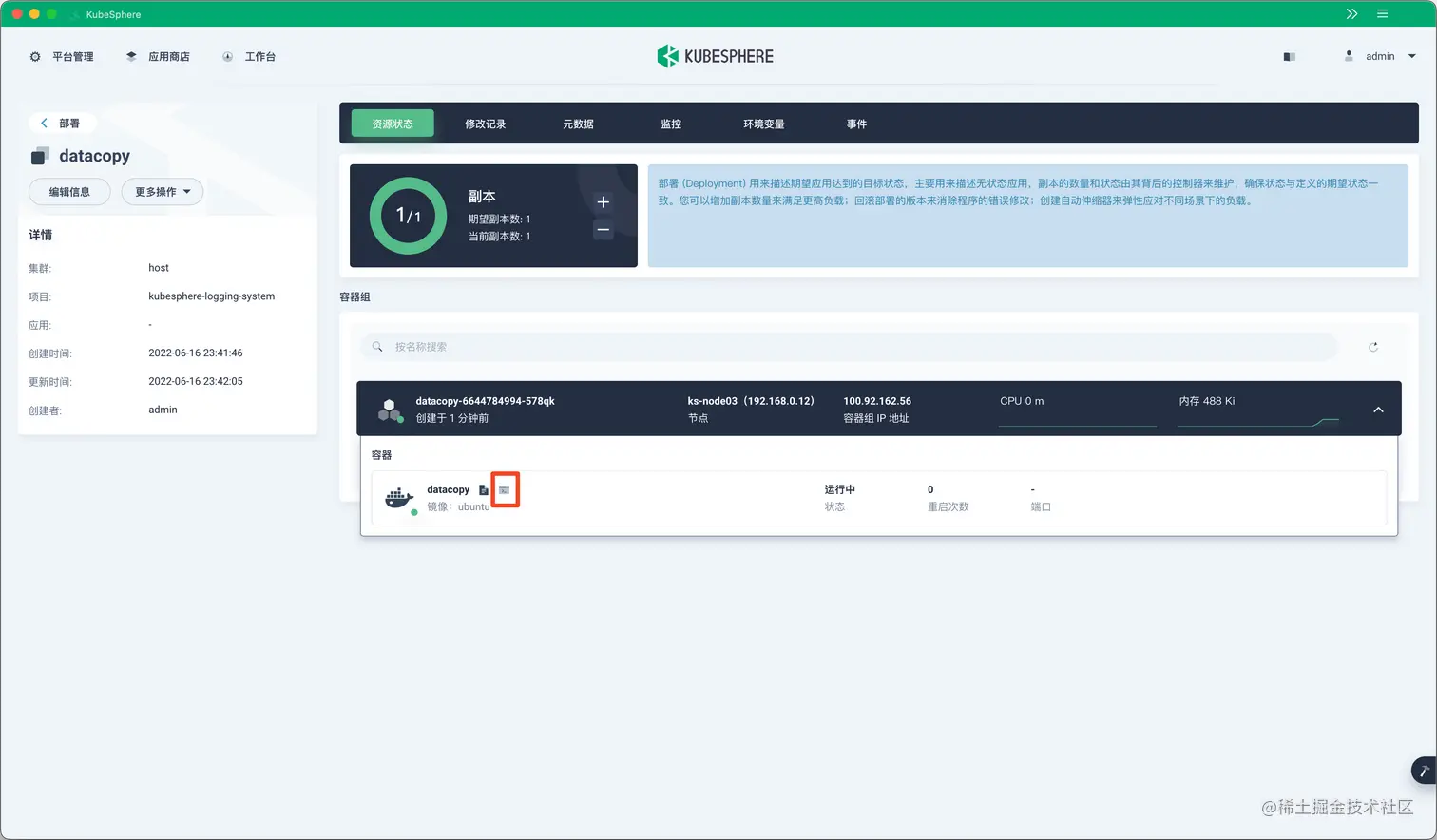 Pod 启动成功后,点击容器的终端图标进入容器的终端。