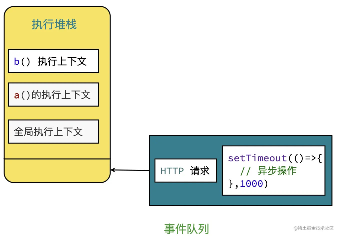 JavaScript 引擎在这里做了一些不同的事情:在执行堆栈的底部,JavaScript 引擎有一个队列数据结构,也被称为{事件队列| Event Queue}。事件队列处理异步调用。