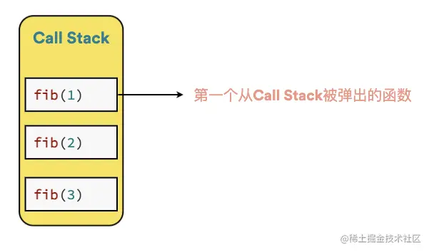 我们可以看到,调用堆栈将对fib()的每一次调用都推入堆栈,直到弹出fib(1)(第一个返回的函数调用)。