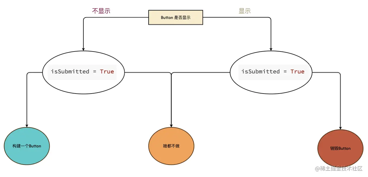 让我们假设 Button 组件有一个 isSubmitted 状态变量。Button 组件的生命周期看起来像下面的流程图,其中每个状态都必须由开发者管理。