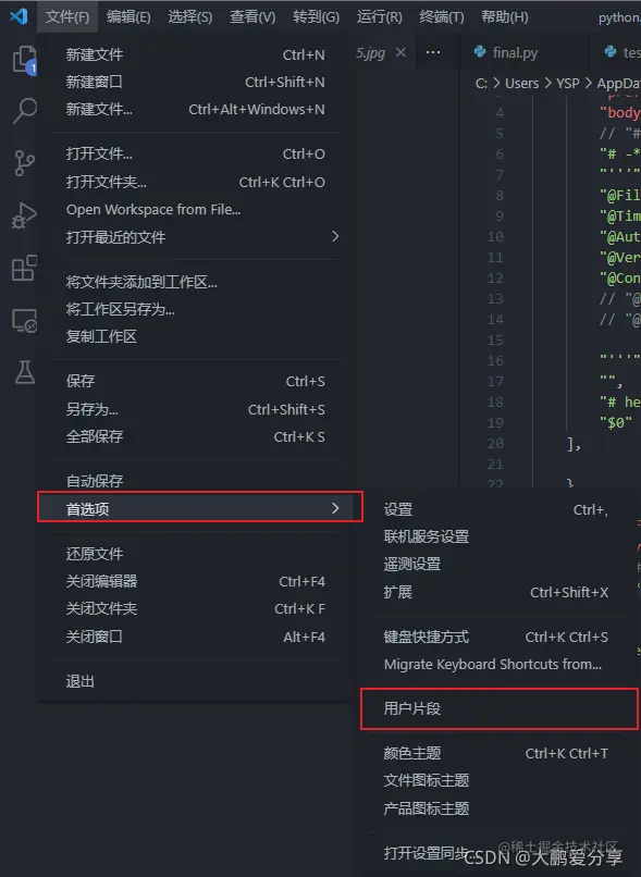 打开VScode——文件——首选项——用户片段 (汉化版)