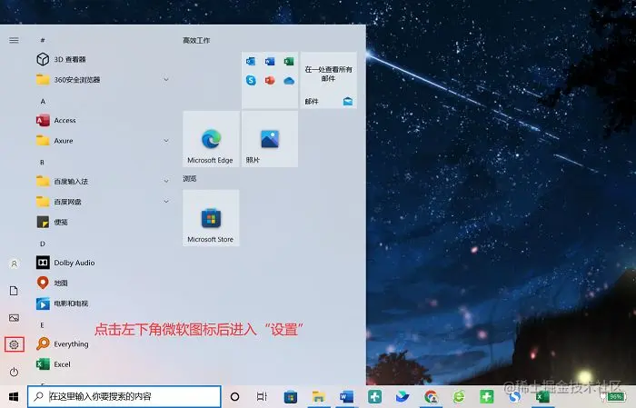 第1步:点击电脑左下角的微软图标,随后点击“设置”(齿轮状小图标);