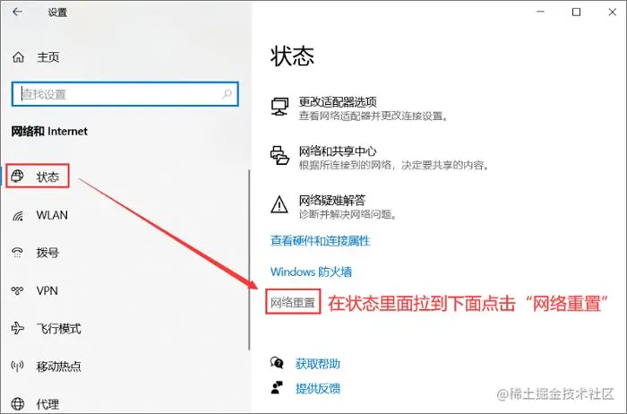 第3步:在“状态”里面点击最下方的“网络重置”,随后点击“立即重置”即可!