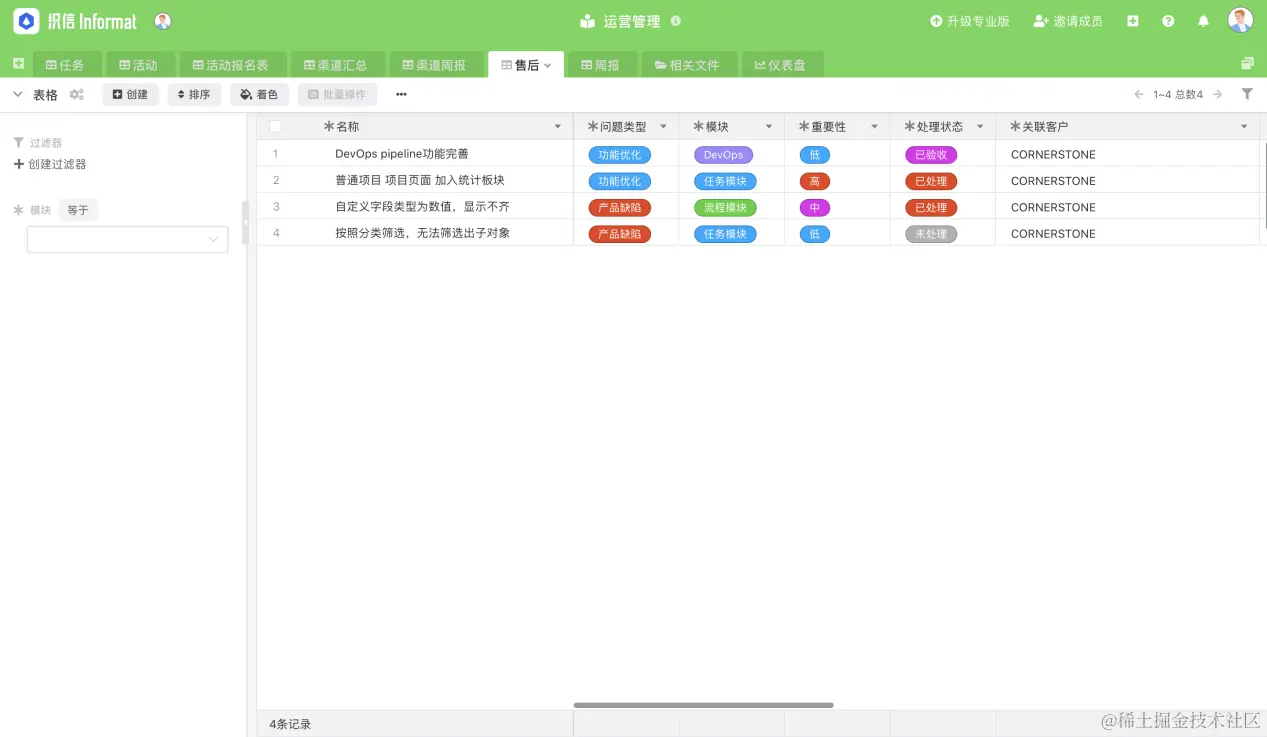 数据往往影响着企业或部门决策,而织信Informat的运营管理系统就是这么一款强大又实用的工具。系统主要包含任务、活动、活动报名表、渠道周报、数据来源、售后、周报、任务活动报表、渠道数据报表、相关文件等10个模块,把日常运营工作都通过系统化、数字化的方式,形成管理流程闭环,将所有运营的数据都能实时的展现给企业。