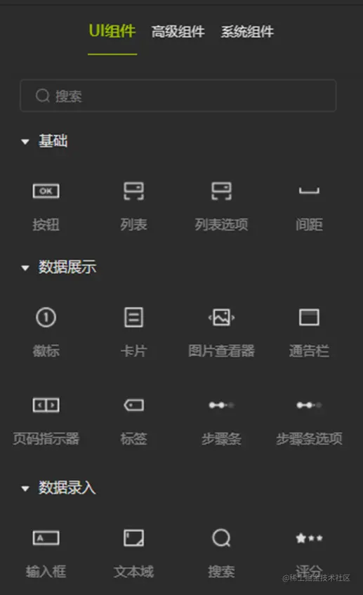 高级组件也可以看做是具备功能逻辑的UI组件。每一个高级组件都具备一个完整的独立功能,也可以看做是具备功能逻辑的UI组件。高级组件中包括了带按钮功能的标题栏、计数器、列表、轮播图等等,样式和功能还是非常丰富的,直接拖拽到中间的画布区域就可以生成了,可以随心所欲的组合,还可以自由修改。