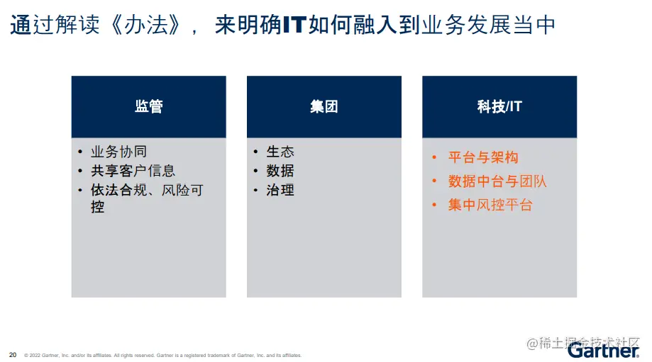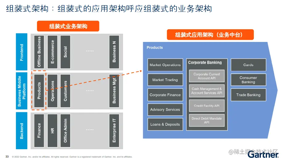 - Gartner 推崇组装式架构,通过组装式的应用架构呼应组装式的业务架构,这点其实跟我们国内讲的数据中台和业务中台是呼应的;