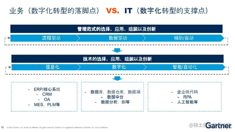 - IT 技术包括曾经的信息化(ERP/CRM/OA/MES等),现在的数字化(数据库/数据仓库/数据湖/数据中台/数据分析等),以及进一步的智能/自动化(低码平台/RPA/人工智能机器学习AI等);