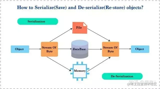 下图中,Java对象被转换成字节流,然后存储在各种形式的存储中,这个过程叫做序列化。图右侧,内存中的字节流转换成Java对象,这个过程叫作反序列化。
