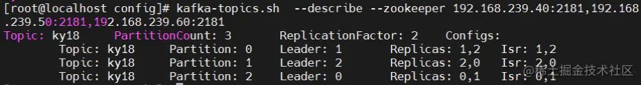 kafka-topics.sh --create --zookeeper 192.168.239.40:2181,192.168.239.50:2181,192.168.239.60:2181 --replication-factor 2 --partitions 3 --topic ky18