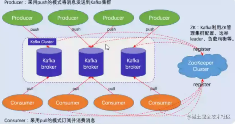 zookeeper 结合kafka:生产者推送数据到kafka集群时需要通过zk寻址kafka的位置,消费者消费哪条数据也需要zk支持,因为可以从zk中获得offset