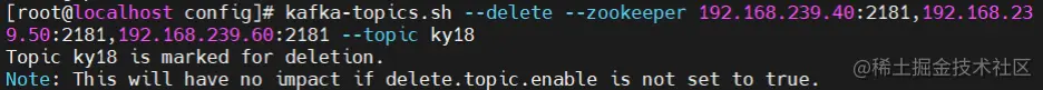 kafka-topics.sh --delete --zookeeper 192.168.239.40:2181,192.168.239.50:2181,192.168.239.60:2181 --topic ky18
