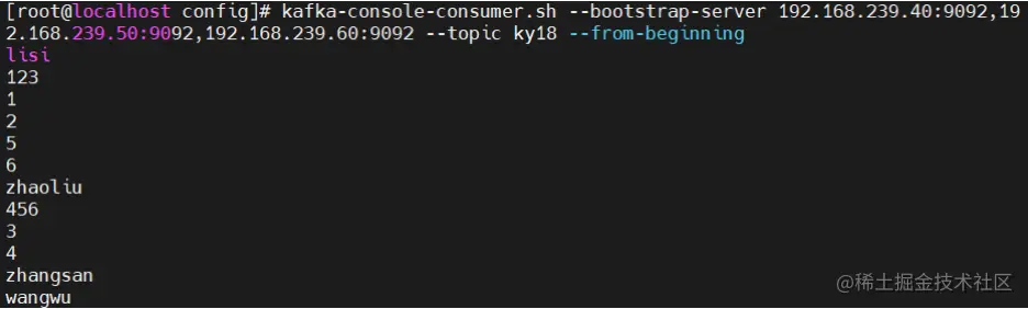 kafka-console-consumer.sh --bootstrap-server 192.168.239.40:9092,192.168.239.50:9092,192.168.239.60:9092 --topic ky18 --from-beginning