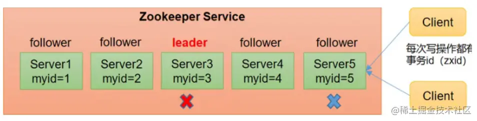 假设zooKeeper由5台服务器组成,SID分别为1、2、3、4、5,ZXID分别为8、8、8、7、7,并且此时sID为3的服务器是Leader。某一时刻,3和5服务器出现故障,因此开始进行Leader选举。