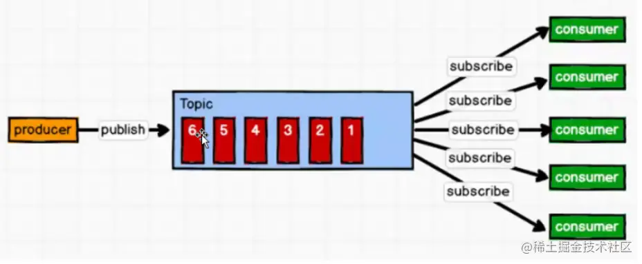 consumer: 消费者pull从broker的topic中拉取消息数据