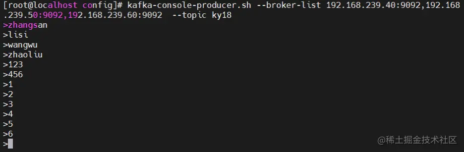 kafka-console-producer.sh --broker-list 192.168.239.40:9092,192.168.239.50:9092,192.168.239.60:9092 --topic ky18