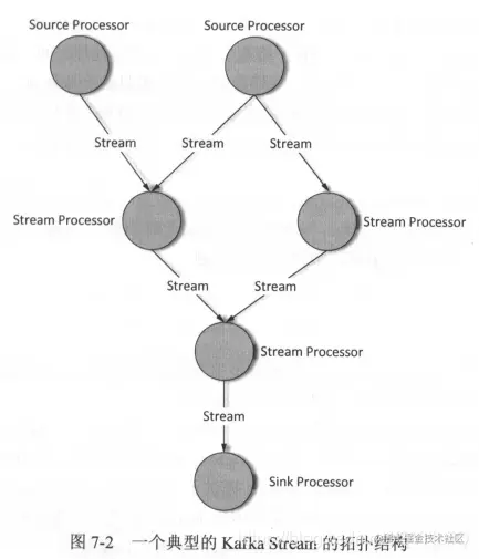 处理器拓扑:可以理解为是一个对数据进行处理的抽象流程图(有向无环图),下面这张图就是一个处理器拓扑,每一个圆圈代表一个处理器,其中有两个特殊的处理器:source processor和sink processor。中间的线段表示流,数据进来后,经过一个一个的圆圈(处理器)之后,将数据输出出去。