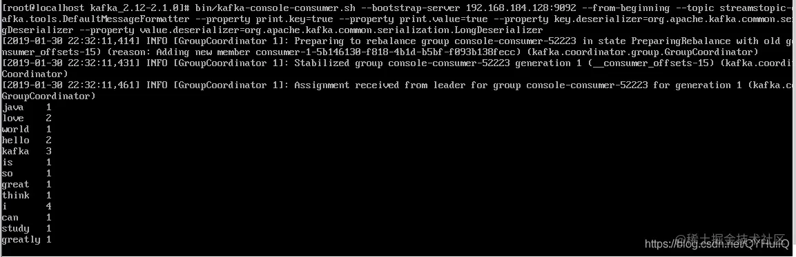 3.2.4使用下面的命令消费输出单词统计处理结果: