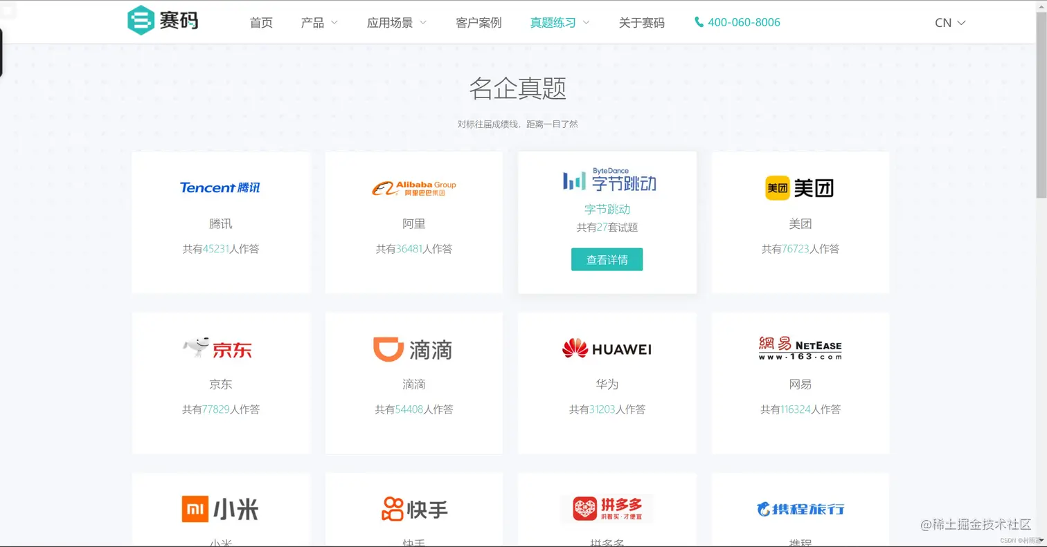 一个免费在线考试系统、在线面试系统,稳定专业且易用。里边汇聚了腾讯、阿里、字节跳动、百度、京东、小米、华为等一线互联网的真题,如果你参加过校招,那么你肯定不会陌生这个网站,因为会有好多公司都会选择在这里进行笔试。