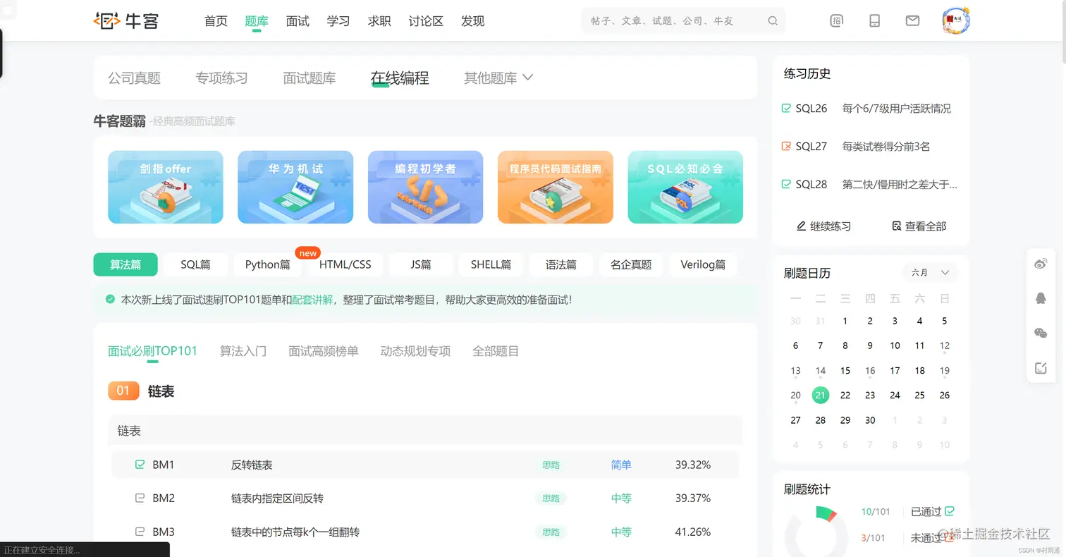 通过在线实操的方式,提升你的编程能力,从而轻松斩获名企 Offer。 这里不仅有实操题目,还有各种精选题目集,更有针对热门编程语言如 Python、Java、SQL 等的学习教程,更有码力评测栏目,快来试试你的码里处于什么段位吧!