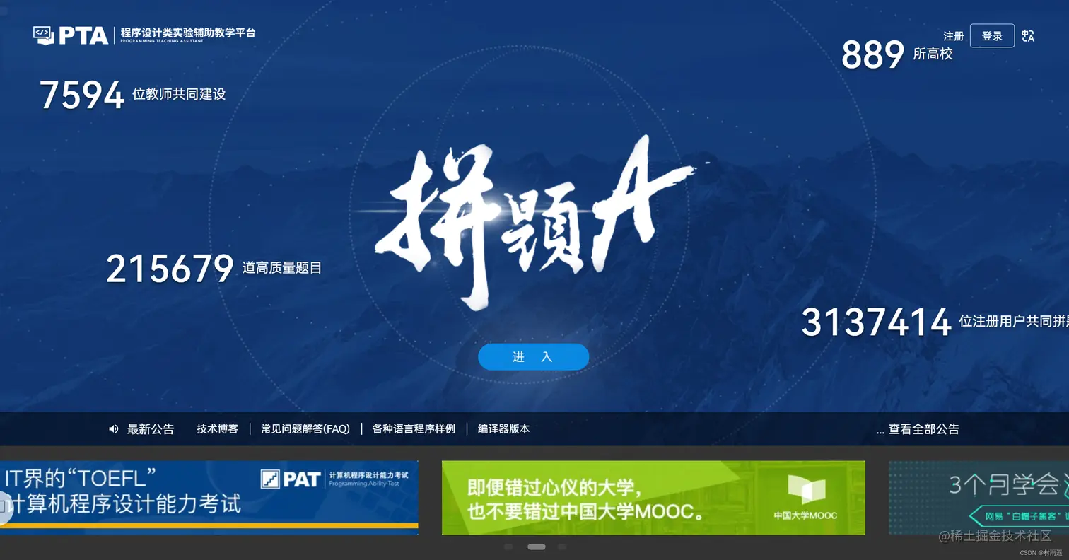 程序设计类实验辅助教学平台,由 7594 位来自 889 高校老师共同创建,囊括了 215679 道高质量题目,而且截止本文写作时已有 3137414 位注册用户。不过里边主要是针对 C、C++ 语言来进行答题,关于更多语言答题,还在进一步扩展中。 如果你在学习 C/C++ 语言,那么不妨进入他们,和各个高校的学子一起在线拼题吧。