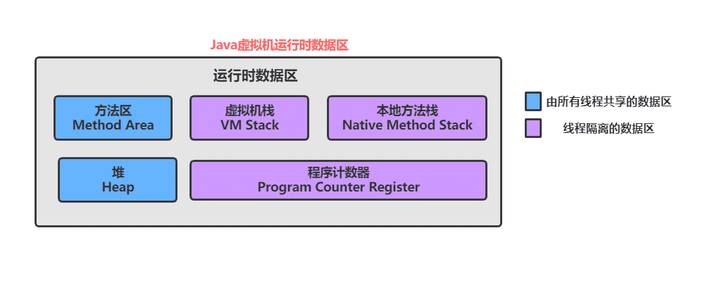 - 方法区(Method Area): 用于存储已被虚拟机加载的类信息、常量、静态变量、即时编译器编译后的代码等数据,方法编译出的字节码就是保存在这个区域
