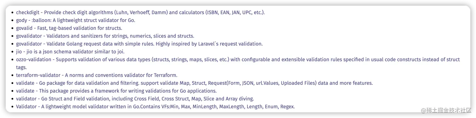 Awesome Go 项目下有用于验证的库。这里推荐如下: