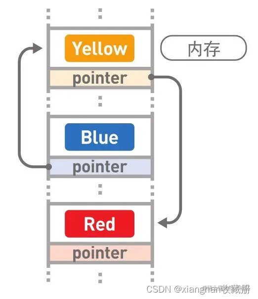 只需要把Green指针指向的位置从Yellow变成Red,删除就完成了。虽然Yellow本身还存储在内存中,但是不管从哪里都无法访问这个数据,所以也就没有特意去删除它的必要了。今后需要用到Yellow所在的存储空间时,只要用新数据覆盖掉就可以了。